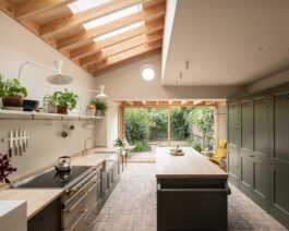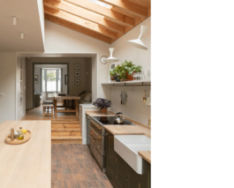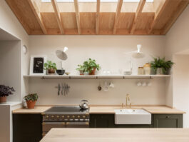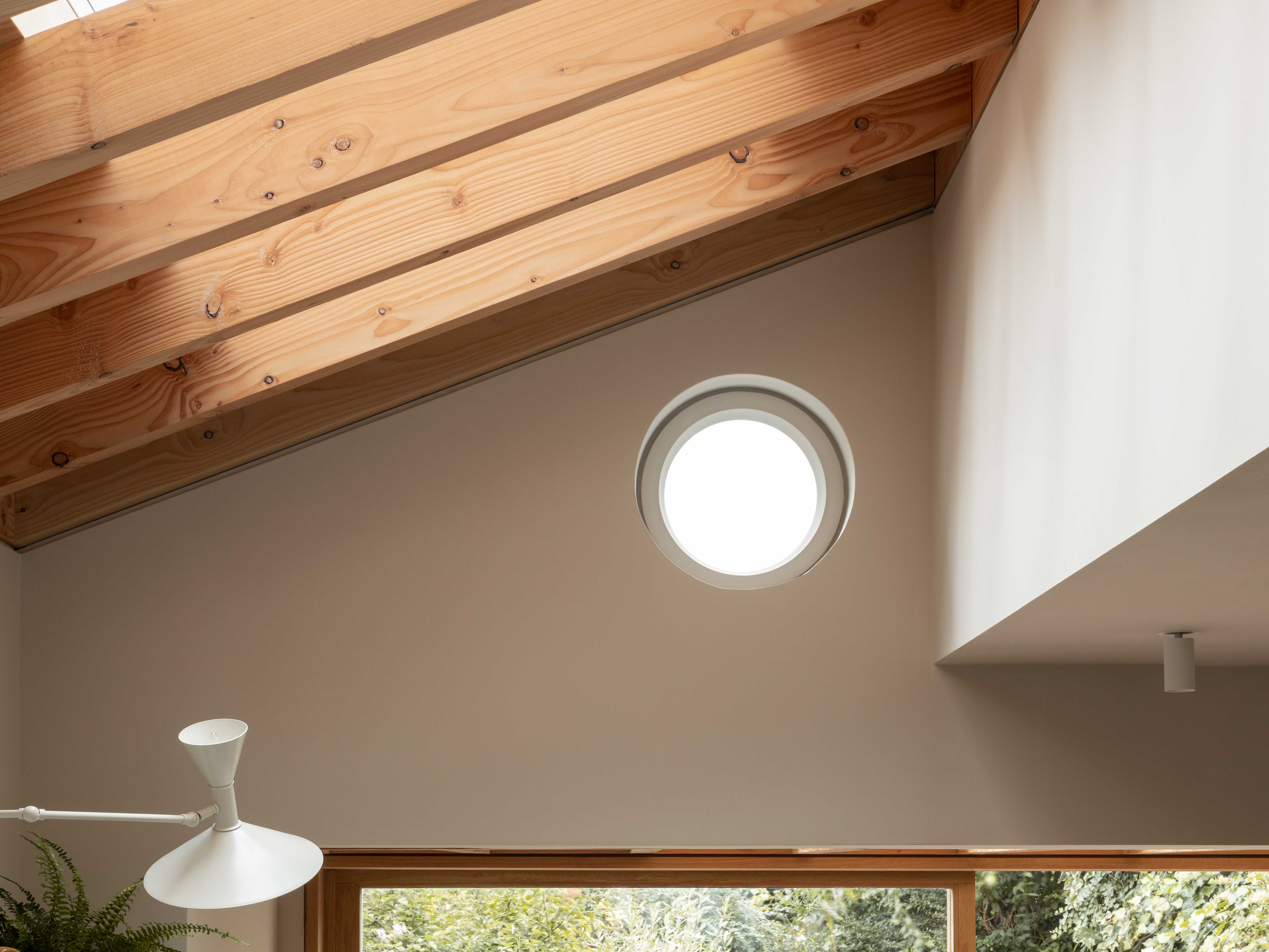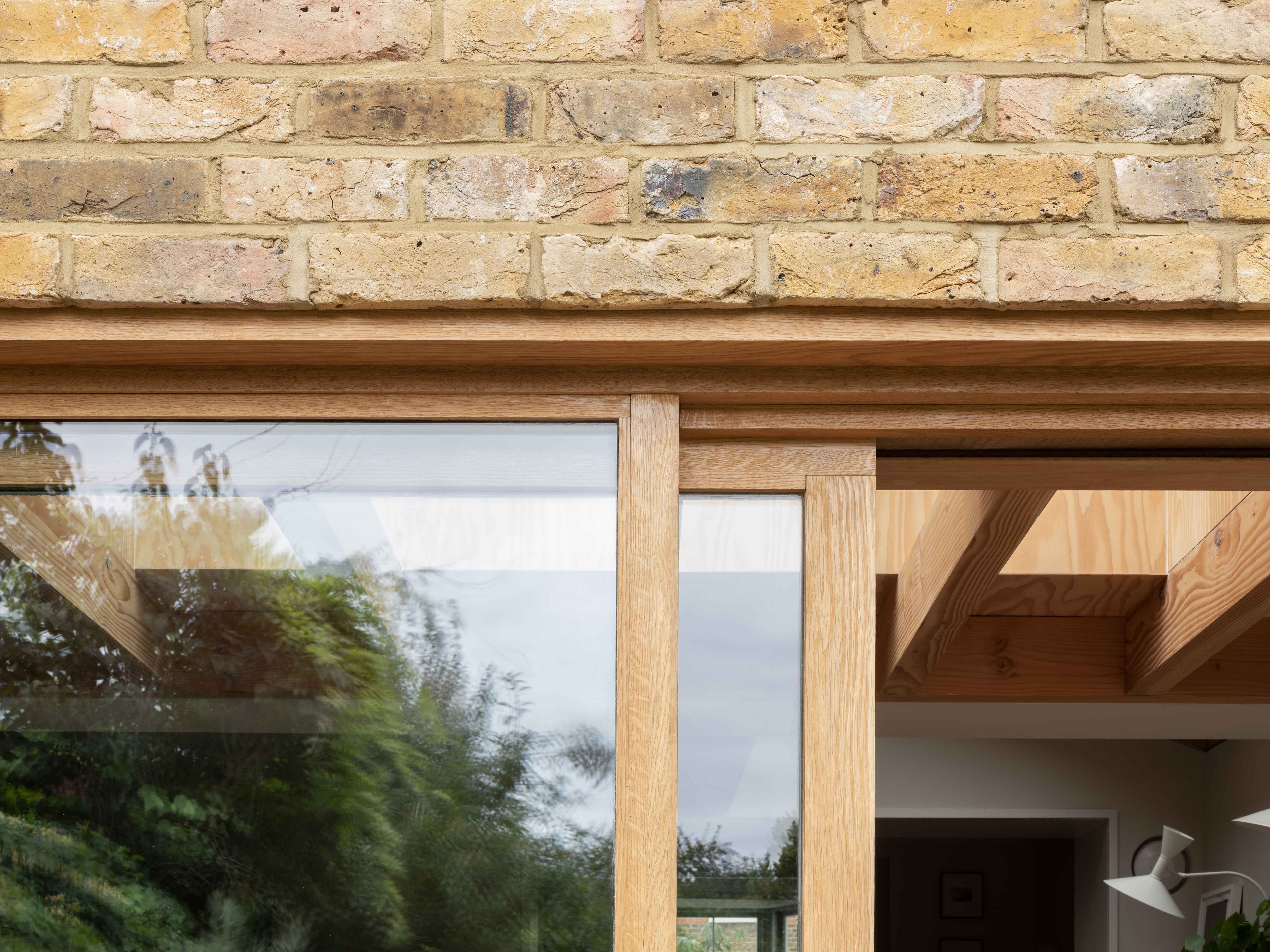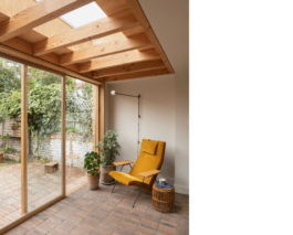 Looking to the back, two roofs with exposed structural timber ceilings can be seen. A bright and tall work space, for cooking and coming together, leads to a lower and more tactile edge at the garden for sitting. The roof’s tell the story of what is new. Their ceiling’s timbers, their explicit roof-ness, express a heightened sense of enclosure and protection from the elements, an experience that often feels far away in a terraced house. At the same time the wood brings warmth and character.