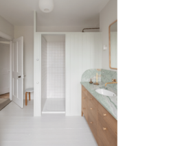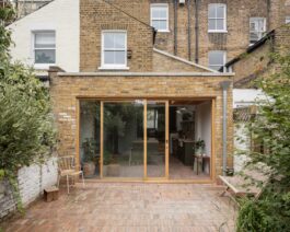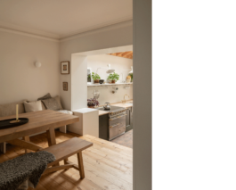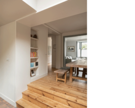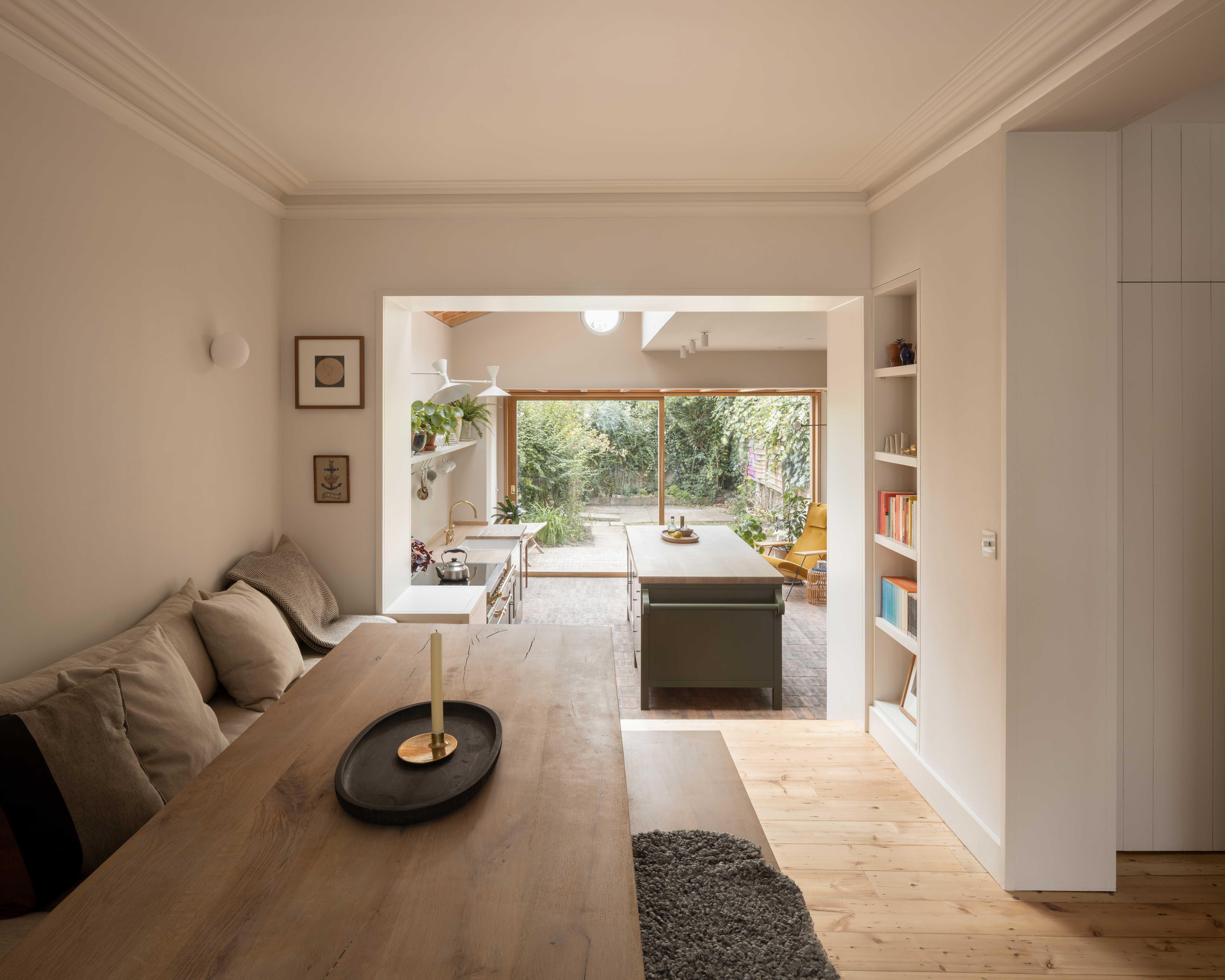 The renovation and extension of a terraced house in Barnes, London. By unlocking the ground floor, a warm and welcoming family home with views opening out to the garden is created. Arriving, one is pulled in by the light falling across the dining table. The table sits at the heart of the plan with an upholstered banquette that gives the space a feeling of intimacy while still be connected to the rest of the house.
